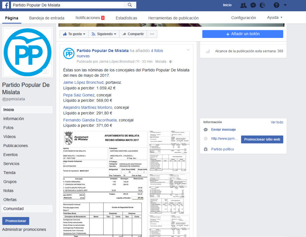El facebook oficial del Partido Popular ha publicado esta mañana las últimas nóminas recibidas por sus concejales en los meses de mayo y junio para, según el portavoz municipal Jaime L. Bronchud, “que todo el mundo tenga acceso de la manera más transparente a la labor del PP de Mislata”.