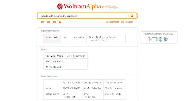 ¿Te gusta ser el que más sabe de personajes famosos en tu grupo? Wolfram Alpha te puede ayudar a acentuar tu conocimiento con todo tipo de parámetros de búsqueda. Puedes saber en qué grupos estuvo un guitarrista, en qué película salieron dos actores diferentes, o qué videojuegos salieron en un mes en particular. Incluso puedes recordar con qué frase empieza una novela clásica.