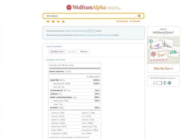 No cuesta nada mirar los valores nutricionales de los alimentos directamente en la etiqueta, pero eso sólo te dice los valores de una porción. ¿Y si lo que quieres saber es cuántas calorías tienen 48 barras de Snickers? Introduce el número de porciones seguido del nombre del alimento o producto y Wolfram Alpha te dirá exactamente lo que vas a comer. Esto es ideal para esas veces en las que el tamaño de la porción es como una cuarta parte de lo que un ser humano normal podría comer y te gustaría saber exactamente cuántas calorías o gramos de proteína estás consumiendo.