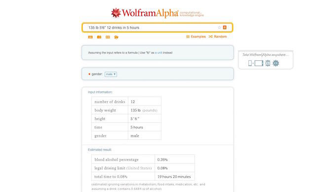 En primer lugar: no deberías depender nunca de Wolfram Alpha para decidir si estás en condiciones para conducir después de beber. Sin embargo, la aplicación permite estimar el porcentaje de alcohol en tu sangre. Sólo tienes que escribir tu peso, tu altura, el número de copas que has bebido y el número de horas que han pasado para obtener una estimación rápida. Recuerda que esto no tiene en cuenta lo que has comido, ni tu metabolismo, ni siquiera el contenido del alcohol de esas bebidas, por lo que sólo debes usarlo como curiosidad.