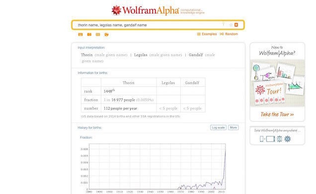 Ya sea porque estés bautizando a tu hijo a tu perro, puede ser curioso conocer la popularidad de un nombre (en Estados Unidos). Wolfram Alpha hace fácil comparar varios nombres, sólo tienes que introducirlosseparados por comas. Algunos de los nombres pueden requerir que añadas la palabra “name” (nombre) si están asociados con otra cosa, como “Gandalf”. Es una oportunidad para saber cuantas “Khaleesi” conocerá tu hija cuando crezca.