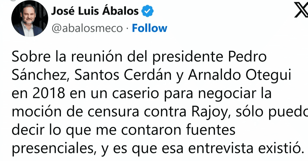 «Solo puedo decir lo que me contaron fuentes presenciales, y es que esa entrevista existió», escribió Ábalos, confirmando así la versión que manejan Koldo García e investigadores del caso, y contradiciendo directamente al presidente del Gobierno y al líder de Bildu, que niegan tajantemente dicho encuentro.