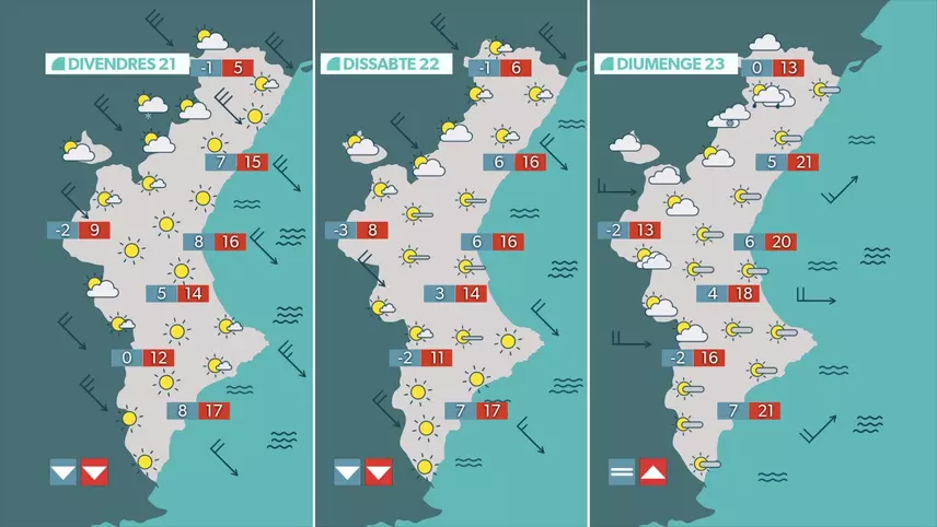 Las temperaturas caerán de forma notable y se registrarán heladas débiles en áreas del interior. El viento del noroeste soplará con fuerza y podrá dejar rachas muy fuertes en las comarcas del norte de Castellón y en las sierras del interior de Alicante.