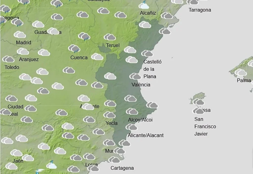 Para el lunes 24, Aemet anticipa una jornada más templada en lo nocturno, con cielos nubosos y la posibilidad de precipitaciones aisladas por la tarde en el interior norte, sur de Valencia y norte de Alicante.