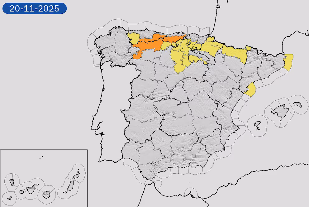 La llegada plena de la masa ártica se notará entre la noche del jueves y la mañana del viernes. La cota de nieve bajará a 300–400 metros en el Cantábrico oriental y el alto Ebro, sin descartar desplomes puntuales.