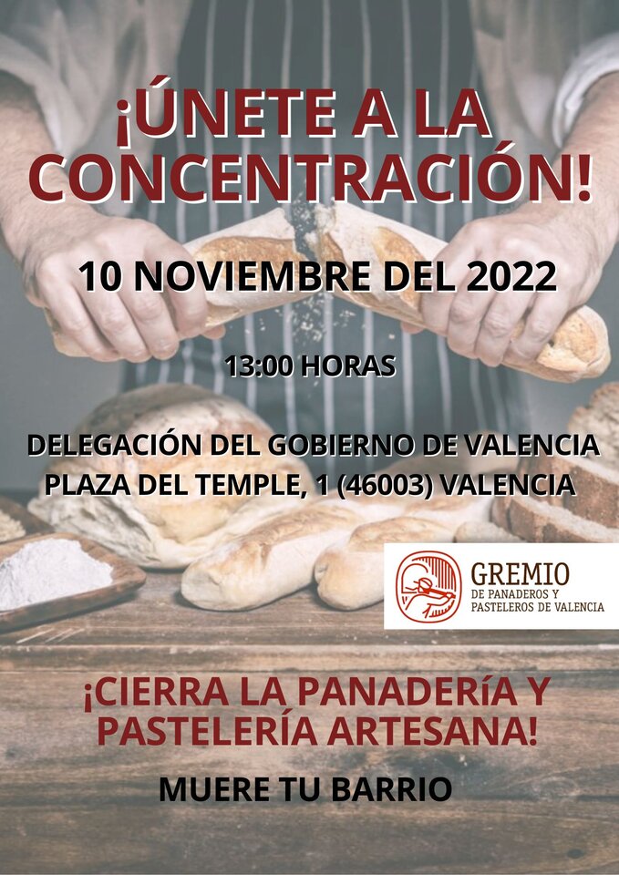 Bajo el lema: “¡¡cierra la panadería artesana!! muere tu barrio” los panaderos y pasteleros de Valencia llaman a una concentración frente a la delegación del gobierno de Valencia el próximo 10 de noviembre.