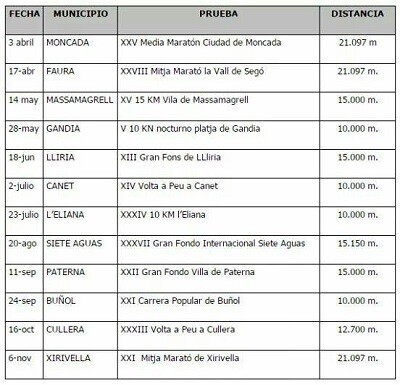 El Circuito está compuesto por tres medias maratones, cuatro grandes fondos, un 12KM y cinco carreras 10K. El plazo de inscripción es del 1 al 30 de marzo y los municipios participantes, además de Buñol, son Moncada, Faura, Massamagrell, Gandia, Llíria, Canet, l’Eliana, Siete Aguas, Paterna, Cullera, Xàtiva y Xirivella.