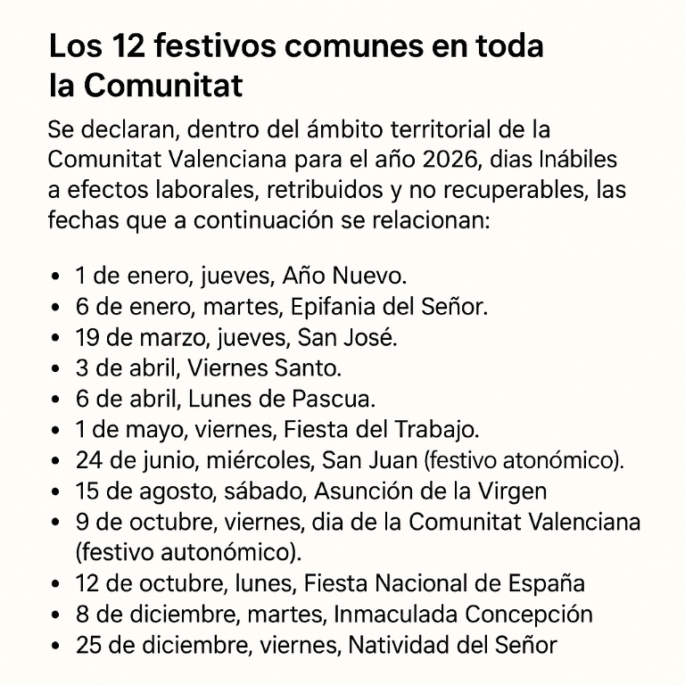 Calendario laboral 2026: estos son los festivos en cada municipio de la Comunitat Valenciana