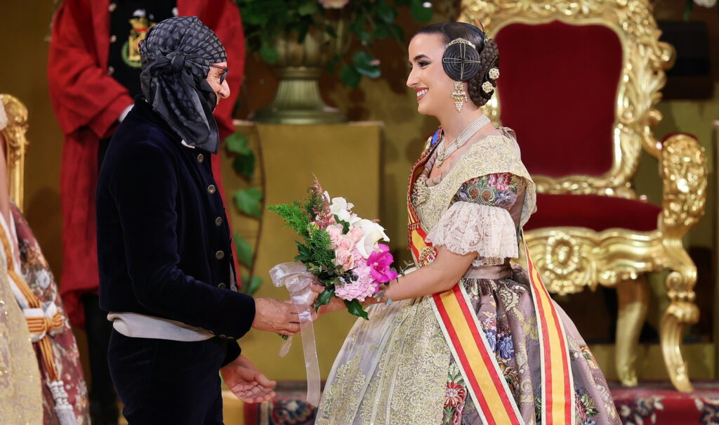 Sobre el escenario la esperaban el presidente de la Junta Central Fallera, Santiago Ballester, y su Corte de Honor. Con ellos compartió uno de los instantes más importantes de su trayectoria fallera.