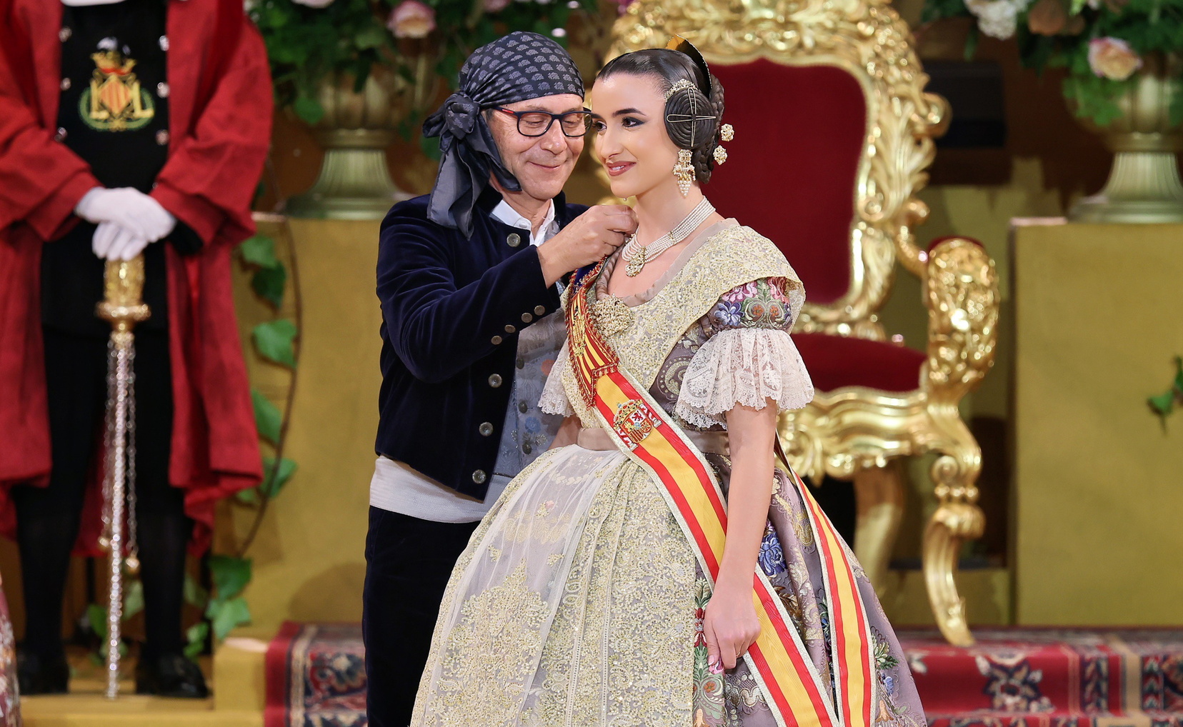 Sobre el escenario la esperaban el presidente de la Junta Central Fallera, Santiago Ballester, y su Corte de Honor. Con ellos compartió uno de los instantes más importantes de su trayectoria fallera.