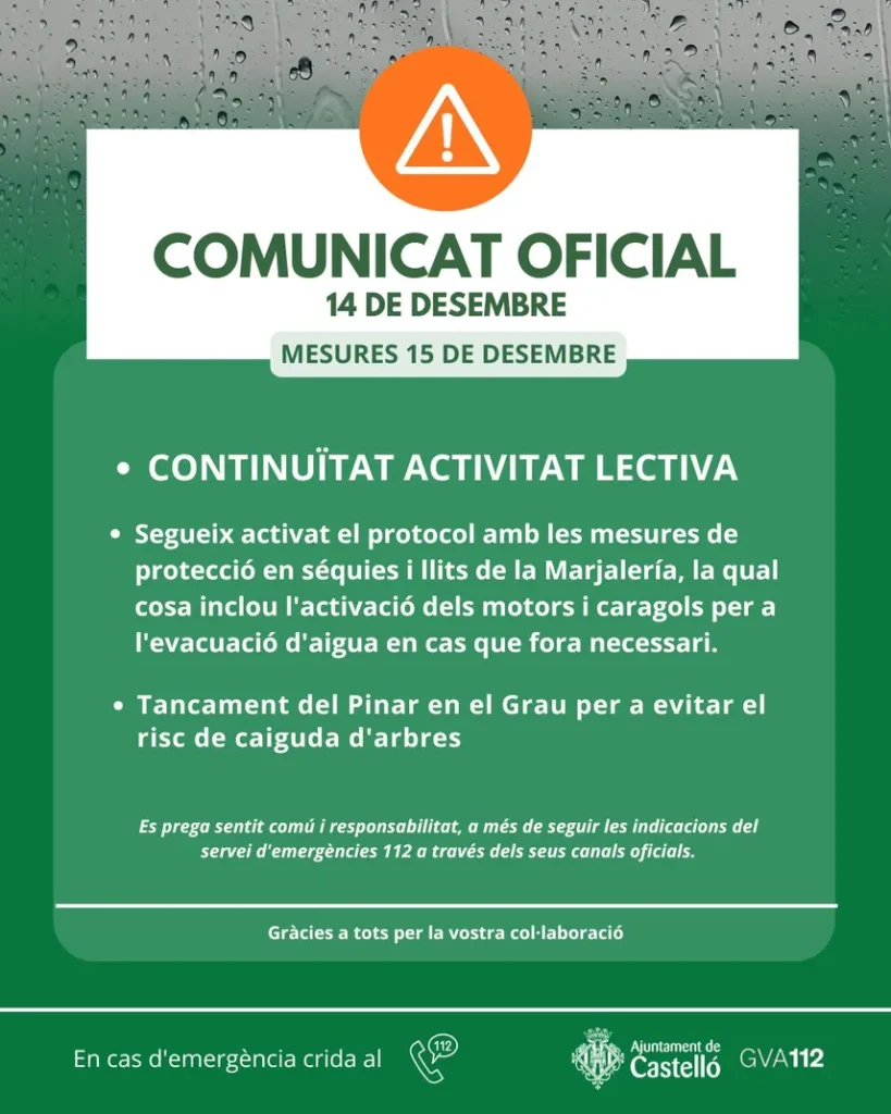 Etiquetas: alerta lluvias, Cecopal, Castelló de la Plana, clases, Pinar del Grao, Marjaleria, prevención