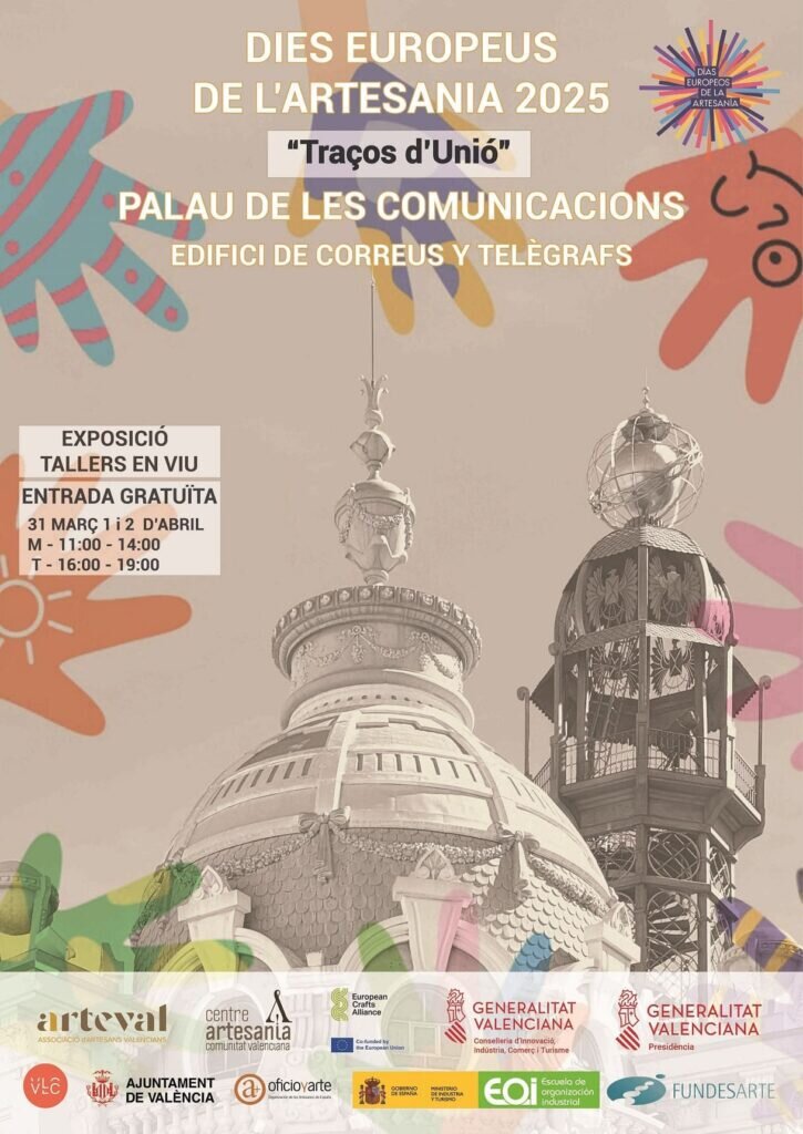 Durante tres días, del lunes 31 de marzo al miércoles 2 de abril de 2025, el Palacio de Comunicaciones de Valencia se transforma en un espacio vivo de creatividad y tradición con motivo de la 3ª edición de los Días Europeos de la Artesanía. Esta acción, impulsada por la Asociación de Artesanos Valencianos (ARTEVAL), tiene como objetivo visibilizar el valioso trabajo de los artesanos locales, sus oficios y las técnicas —tanto tradicionales como contemporáneas— que siguen marcando la identidad cultural valenciana.
