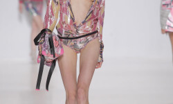 Predominan los mini vestidos de corte babydoll creados a base de geometrías, los mini abrigos y chalecos. Las micro faldas y shorts descienden a la cadera y son de corte evasée en puntillas y guipur o de sedas estampadas con efecto pitón como los pantalones largos de corte recto. Se combinan con sudaderas caladas de guipures geométricos ondulantes con acabados geométricos o con tops bandeau en su mínima expresión.