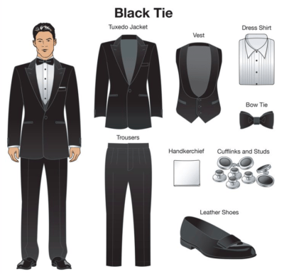 Es el equivalente del esmoquin para el hombre o del vestido cóctel para las mujeres. La denominación en Estados Unidos es Tuxedo.