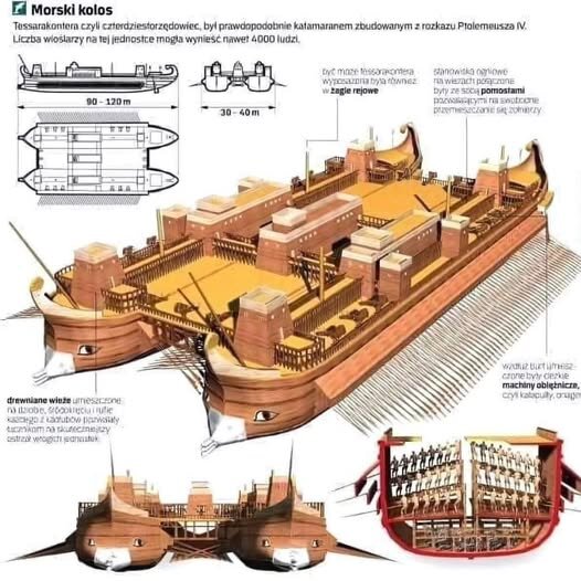 - Tripulación: Según fuentes antiguas y como se indica en la imagen, podía albergar hasta 4.000 remeros y cientos de marineros y soldados.