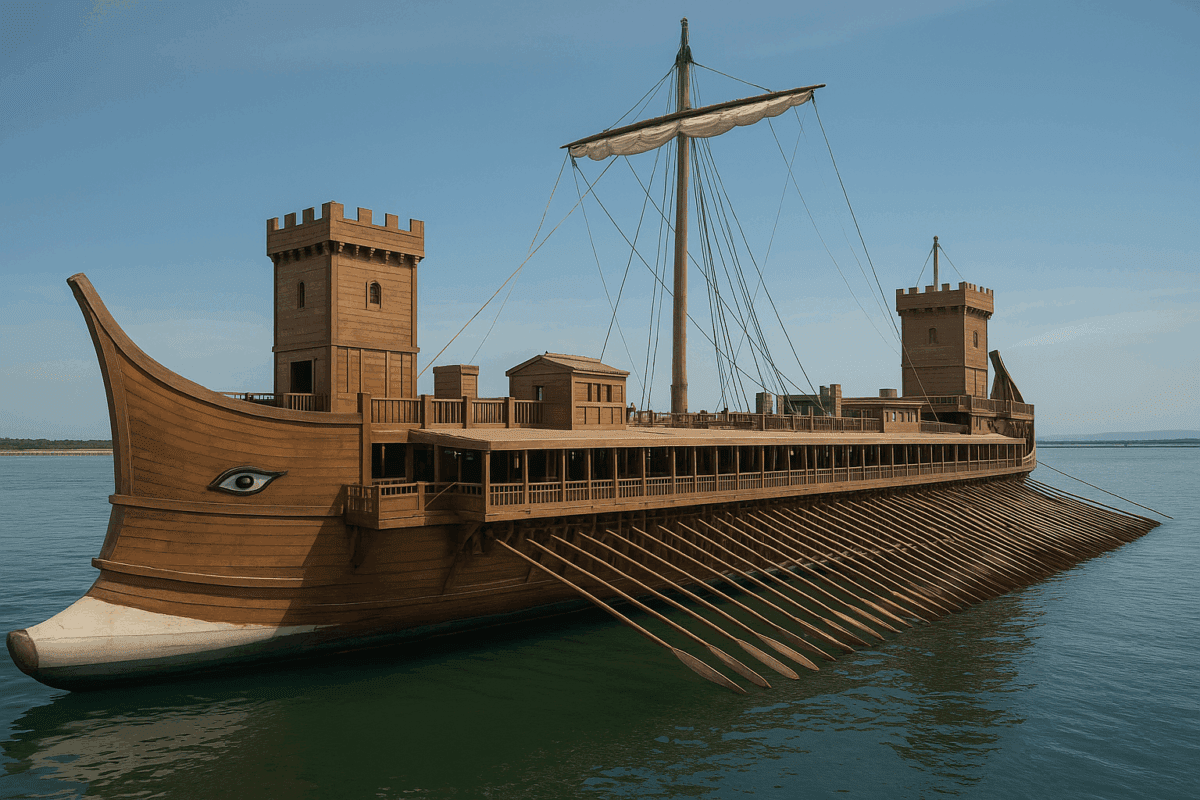 Una gigantesca silueta emerge entre la bruma matinal del Mediterráneo. Con casi 120 metros de eslora y dos cascos paralelos unidos por una cubierta fortificada, el Tessarakonteres, la mítica galera de cuarenta hileras de remos mandada construir por Ptolomeo IV Filopátor en el siglo III a. C., ha vuelto a la vida. Una reconstrucción exacta, fruto de décadas de investigación arqueológica, ingeniería naval y pasión histórica, ha convertido la leyenda en realidad.