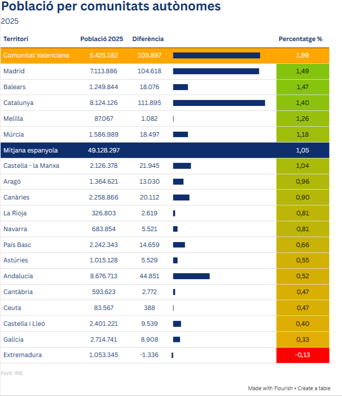 Con 5.425.182 habitantes, la Comunitat Valenciana ha sumado 105.897 personas en solo un año, solo superada por Cataluña en cifras absolutas, pero líder en crecimiento porcentual.