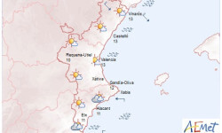 La Agencia Estatal de Meteorología prevé para esta jornada “cielo nuboso tendiendo a poco nuboso por la tarde. Precipitaciones débiles avanzando de norte a sur, localmente más intensas en el interior y que remitirán por la tarde. Temperaturas en descenso, sobre todo las nocturnas en el interior. Viento del oeste y noroeste moderado con intervalos de fuerte, sobre todo en el interior, con rachas de 100 km/h en Valencia y norte de Alicante a primeras horas, y de 80 km/h en Castellón”.