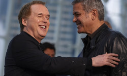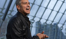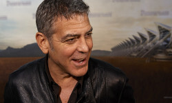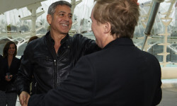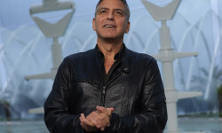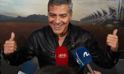 Clooney deslumbró bajo la lluvia en la presentación de ‘Tomorrowland’ en Valencia.Vestido con un pantalón negro y chaqueta de cuero, Clooney no dudó en pararse para saludar al público, posando ante los fotógrafos junto al director del filme, Brad Bird, y sus compañeras, la joven Britt Robertson y la niña Raffey Cassidy, y no dudó en bromear con los periodistas, ante los que afirmó que esa misma noche tenía previsto comer paella y pidió recomendaciones sobre qué tipo pedir.