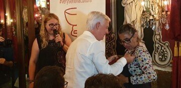 Rodeada de público la actriz de origen cubano recibió el reconocimiento artístico “Valencia 2019, Ciudad del Grial” de manos de doña Esther Santillana Reinoso responsable del programa “ver y sentir la cultura” del Centro Óptico Losan y gerente del premio.