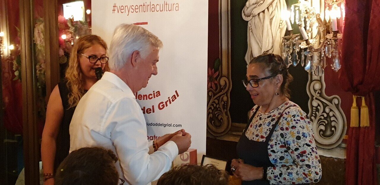 Rodeada de público la actriz de origen cubano recibió el reconocimiento artístico “Valencia 2019, Ciudad del Grial” de manos de doña Esther Santillana Reinoso responsable del programa “ver y sentir la cultura” del Centro Óptico Losan y gerente del premio.