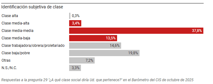 La otra cara de la moneda la ofrecen las encuestas de autopercepción. En los barómetros de opinión, aproximadamente la mitad de la población española sigue identificándose como clase media, aunque con matices: crece el peso de quienes se definen como clase media-baja o trabajadora y aumenta también el porcentaje de quienes se consideran clase baja o en situación precaria.