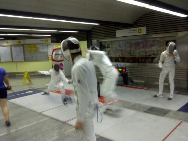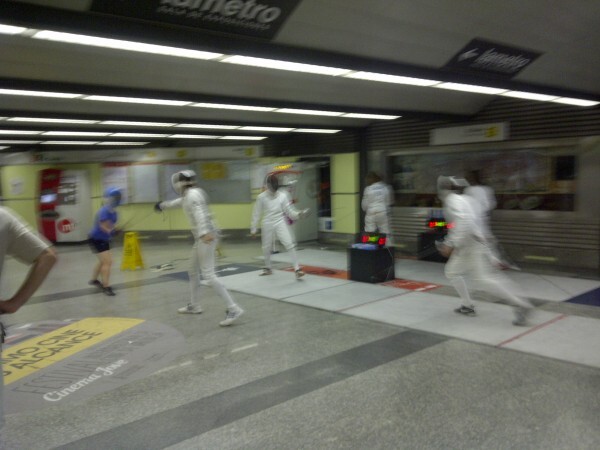 Curiosa la imagen que se vivió ayer en esta céntrica estación de metro, donde se podÍan observar asaltos de esgrima tanto en el andén, como en el hall y en la salida de la plaza de los Pinazo.