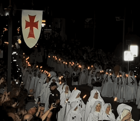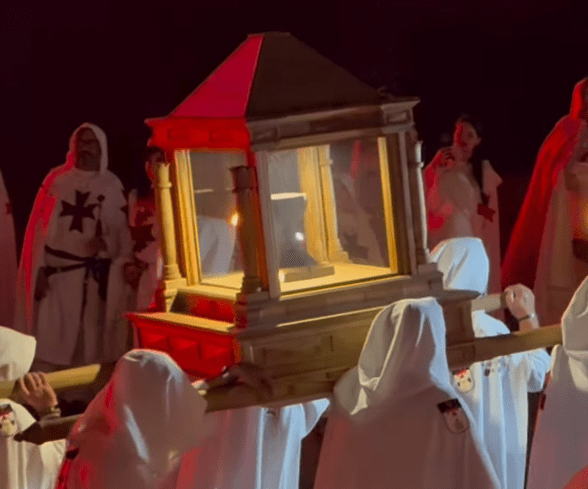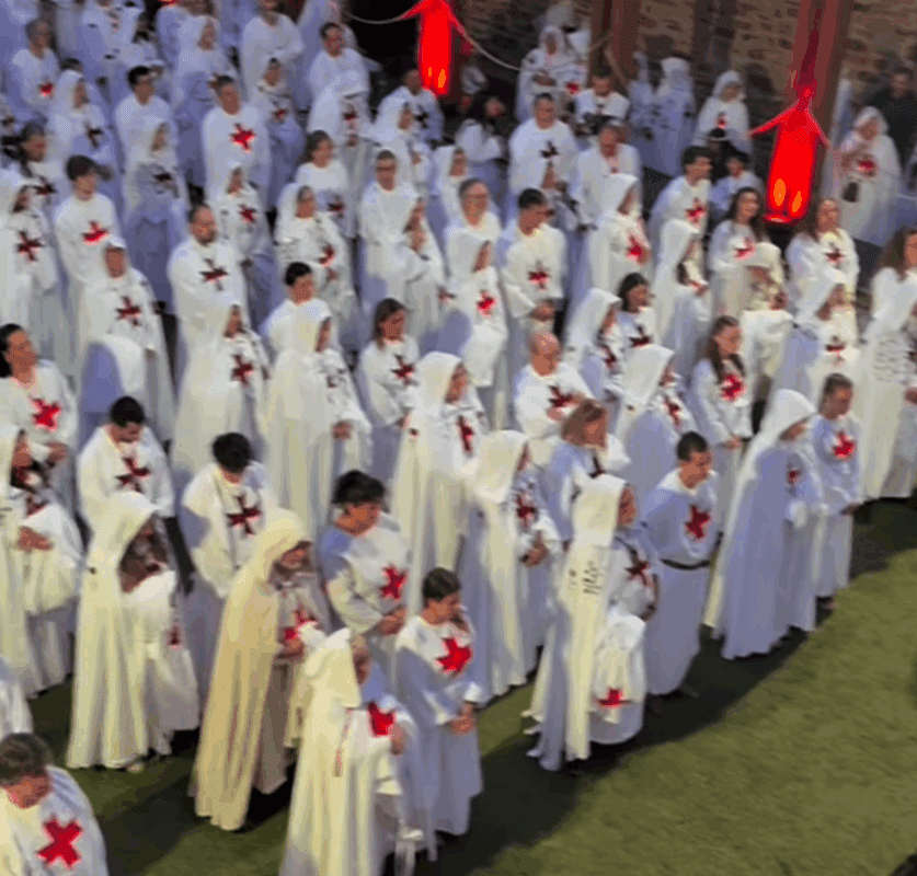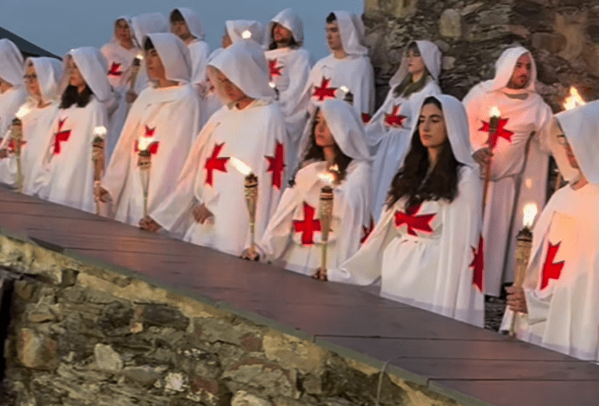 El momento más esperado llegó con el gran desfile templario. Desde la orilla del río Sil, los caballeros escoltaron las dos reliquias sagradas —el Arca de la Alianza y el Santo Grial— en un recorrido solemne hasta la fortaleza. Allí fueron recibidas por el Maestre Guido de Garda, encargado de renovar el compromiso de la Orden con la protección de los peregrinos y la custodia de los símbolos. La ceremonia culminó con un despliegue pirotécnico y un juego de luces que iluminó las murallas medievales.