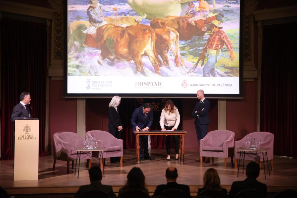 El acuerdo ha sido firmado en el Ateneo Científico, Literario y Artístico de Madrid por la alcaldesa de València, María José Catalá, y el presidente de la Generalitat, Juan Francisco Pérez Llorca, en presencia del director de la Hispanic Society of America, Guillaume Kientz, y de la bisnieta del pintor, Blanca Pons-Sorolla.