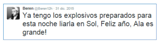 La Policía Nacional ha identificado y localizado al presunto responsable de dos perfiles de la red social Twitter desde los que se exaltaba la violencia de género y el terrorismo. A esta persona, creador de los perfiles @Beren12h y @Beren4coma9, se le atribuye la comisión de delitos de odio y enaltecimiento del terrorismo. Seguidores de la cuenta oficial de la Policía Nacional en Twitter alertaron a los ciberagentes de la difusión de los comentarios presuntamente delictivos.