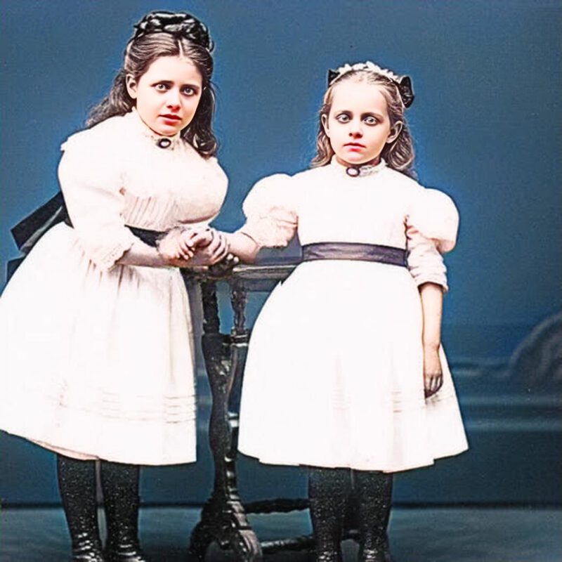 La imagen, atribuida al estudio J. Morrison and Sons de Filadelfia, mostraba a dos niñas tomadas de la mano, vestidas de blanco y situadas ante un fondo pintado de estudio. Durante décadas se interpretó como una simple fotografía infantil, deteriorada por el paso del tiempo y el efecto de la humedad.
