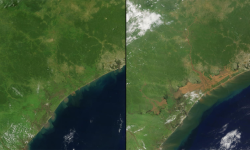 Semanas de fuertes lluvias en 2014 causadas por una fuerte perturbación tropical fueron las responsables de que el Licungo y otros ríos de la provincia de Zambezia, en Mozambique (imagen a la izquierda), se desbordaran e inundaran lo que encontraron a su paso. A la derecha, en 2015, las aguas habían remitido