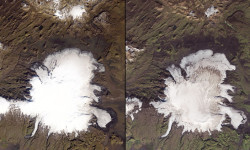 Islandia es famosa por sus glaciares y el hielo que impera en la isla. Sin embargo, estas imágenes demuestran cómo el cambio climático está deshaciendo el atractivo natural del país. A la izquierda, el Mýrdalsjökull en 1986. A la derecha, el mismo lugar en 2014