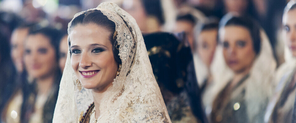 Para poder contemplar en toda su belleza el manto de la Virgen, es preciso rodearla hasta contemplar su rostro, el niño, la manteleta que evoca la indumentaria tradicional valenciana… Una preciosidad. Una multitud se fotografía ante la imagen, mira hacia arriba, admira el entorno.