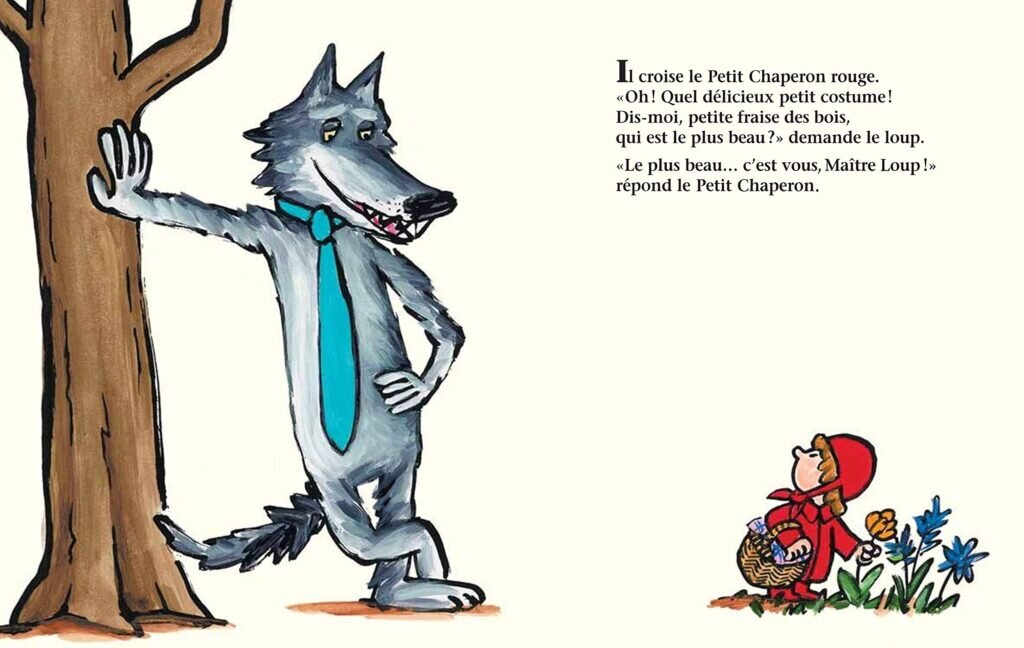Un jour, le loup enfile son plus beau costume et part se promener dans la forêt pour se faire admirer. Il rencontre le petit chaperon rouge, les trois petits cochons, les sept nains, Blanche-Neige et le petit dragon. Et, les méprisant tous, il pose la même question : qui est le plus beau? Et ils répondent tous la même chose parce qu’ils ont peur du loup : Le plus beau, c’est toi, le loup. Tous, sauf le petit dragon, qui dit autre chose : Le plus beau est mon père. Et quand il dit cela, il crache du feu sur le loup qui se retrouve sans fourrure. En fin de compte, le loup a changé et maintenant c’est un perdant et avant c’était un loup fier et vaniteux.