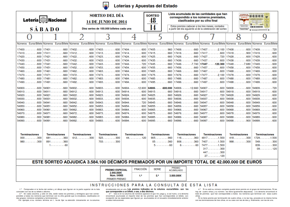 14DEJUNIODE2014 48 clasificados por su cifra final Diez series de 100.000 billetes cada una 14 a partir del día siguiente al de la celebración del sorteo Estos premios caducan a los tres meses, contados |