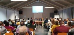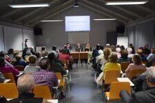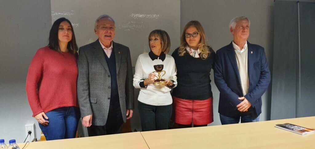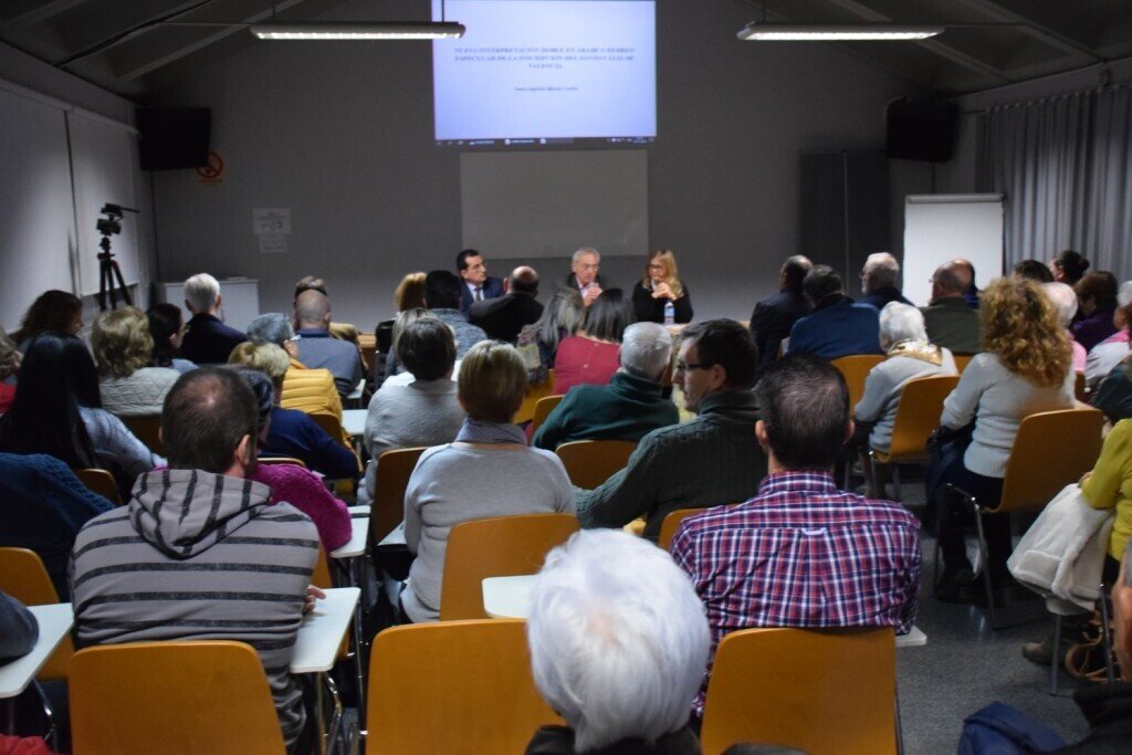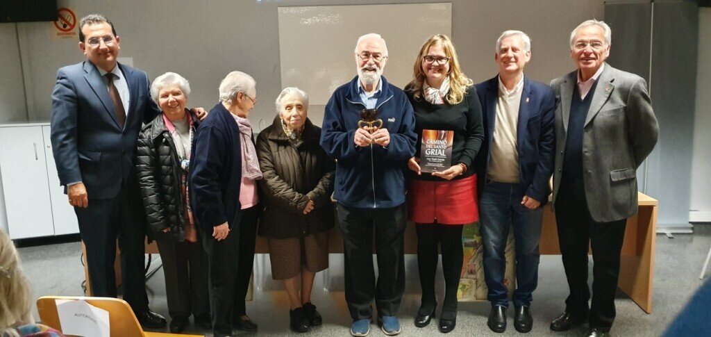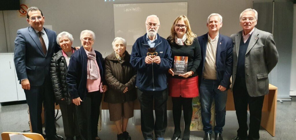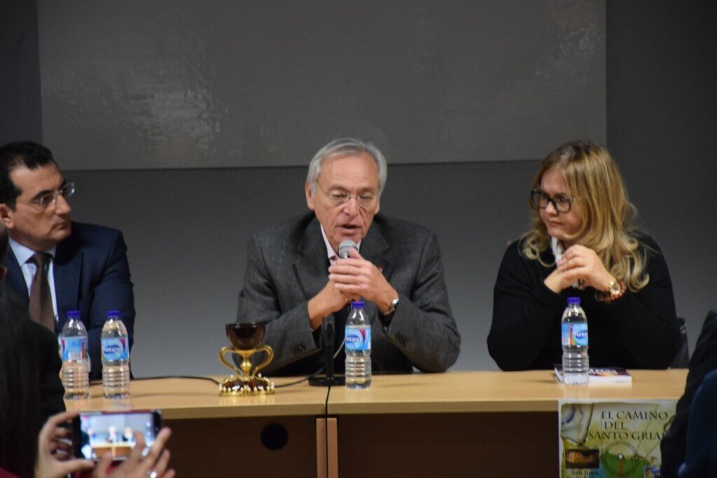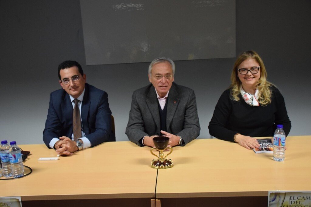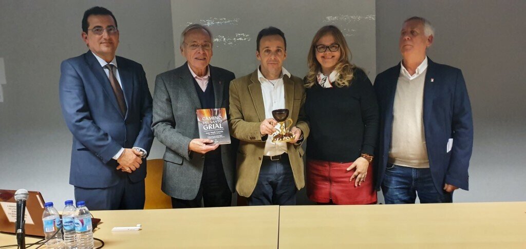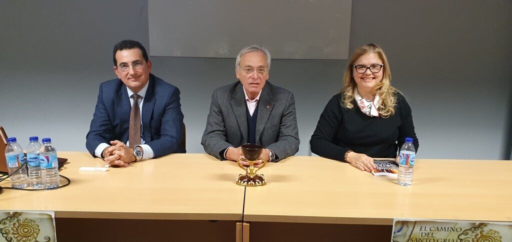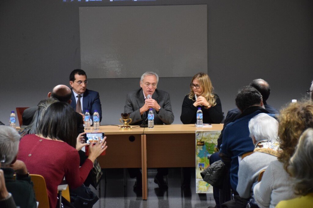 El acto de presentación fue presidido por D. Enrique Senent, presidente de la Asociación, que puso en valor el trabajo realizado desde sus comienzos y dio constancia de cómo fueron ellos los impulsores de las actuales estatuas del camino, con la contratación del artista Antonio Peris Carbonell y cesión por parte del ayuntamiento de un local para realizar los trabajos. La Dra. Ana Mafé hizo referencia a los comienzos de este proyecto en el 2002 a iniciativa de la Cofradía del Santo Cáliz de Valencia y la Gestora Turística de San Juan de la Peña con la que se decide la puesta en marcha del proyecto “El Camino del Santo Grial”. El acto de presentación terminó con la conferencia sobre la epigrafía del Santo Cáliz por D. Juan Agustín Blasco Carbó licenciado en Ciencias Religiosas, y que apunta que la inscripción en la base del Santo Cáliz, descubierta en 1960 por el profesor Antonio Beltrán, “juega genialmente con el alfabeto y con la grafía siendo capaz de significar una misma cosa, ´Jesús Dios`, en hebreo reflejado y en árabe, con la particularidad de que la palabra ´Dios` se escribe de la forma que ellos lo utilizan en cada lengua”, Blasco apoya la tesis de que el grabador realizó, con esta intención, la inscripción doble en hebreo y árabe con un mismo significado, ha subrayado.