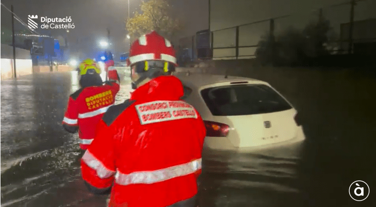 Los bomberos rescatan a dos personas atrapadas en un coche en una calle inundada de Vila-real