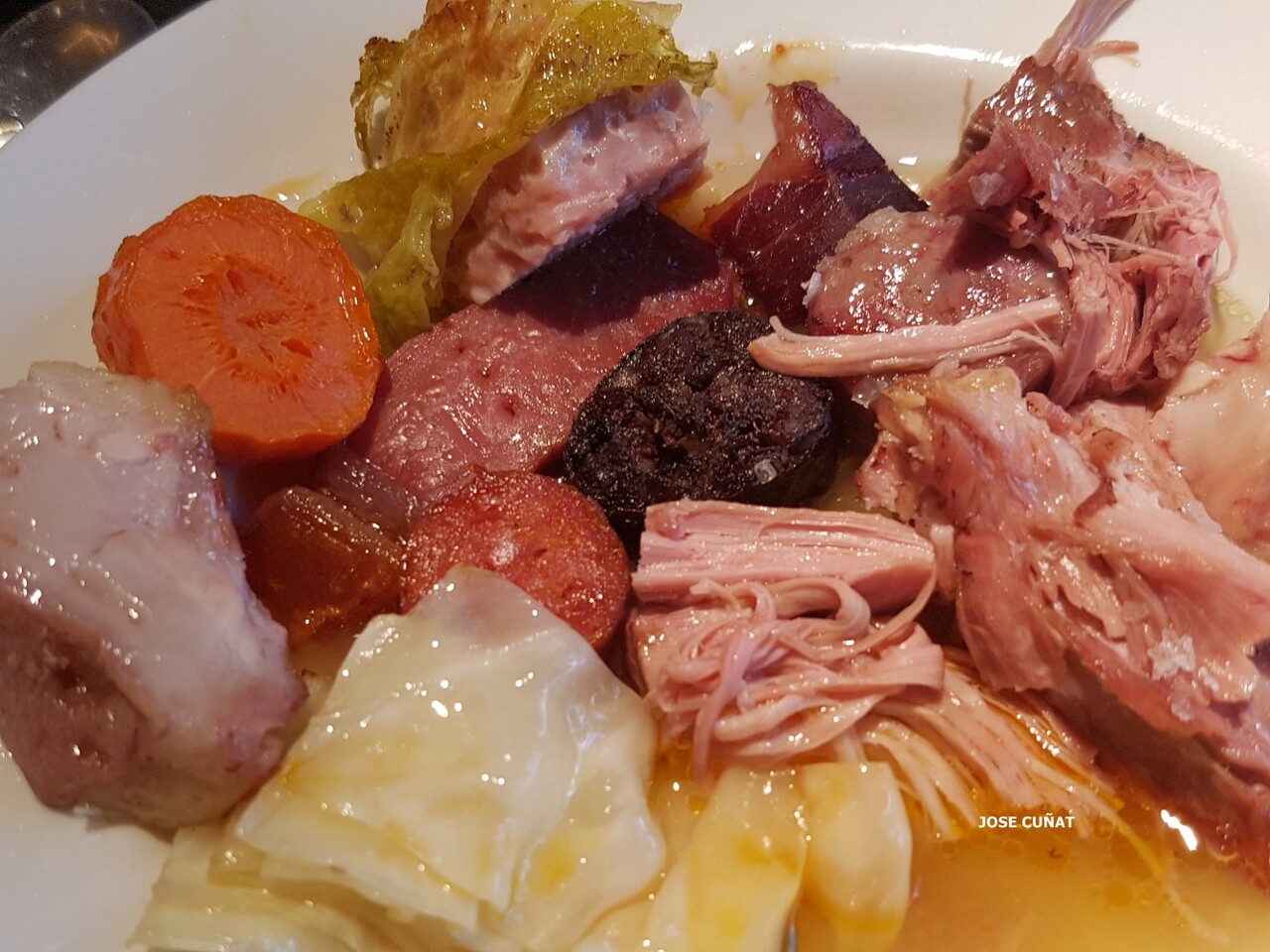Dentro de la datación realizada del puchero podríamos englobarlo en un contexto de “cocido reinventado ordinario” y no pretendo con esta palabra menospreciar el plato, sino más bien basarlo en el tipo de componentes, más vegetal, garbanzos, patatas y básicamente productos de temporada, – nabo, zanahoria, carlota, cardo o penca, repollo – hasta calabaza. Y de carnes; vaca, cerdo; tocino fresco y codillo, aunque me imagino que aderezado con gallina o pollo, no la pude apreciar en el plato, que sirven deshuesado para un mejor acondicionamiento y servicio. Con añadido de jamón y embutidos; chorizo, morcilla y longaniza.