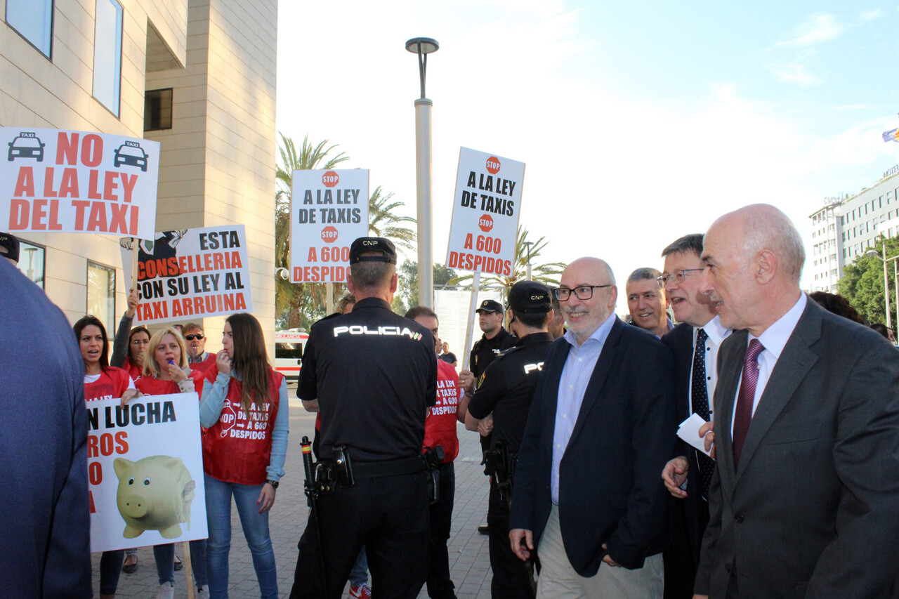 Además de protestar contra Ximo Puig, los taxistas de la Plataforma de Afectados por la Nueva Ley del Taxi dirigieron su pitada al president de Les Corts, Enric Morera, así como al portavoz socialista del Parlamento Valenciano, Manuel Mata, por haber aprobado una ley que va a generar cientos de despidos y que abre la puerta al intrusismo.
