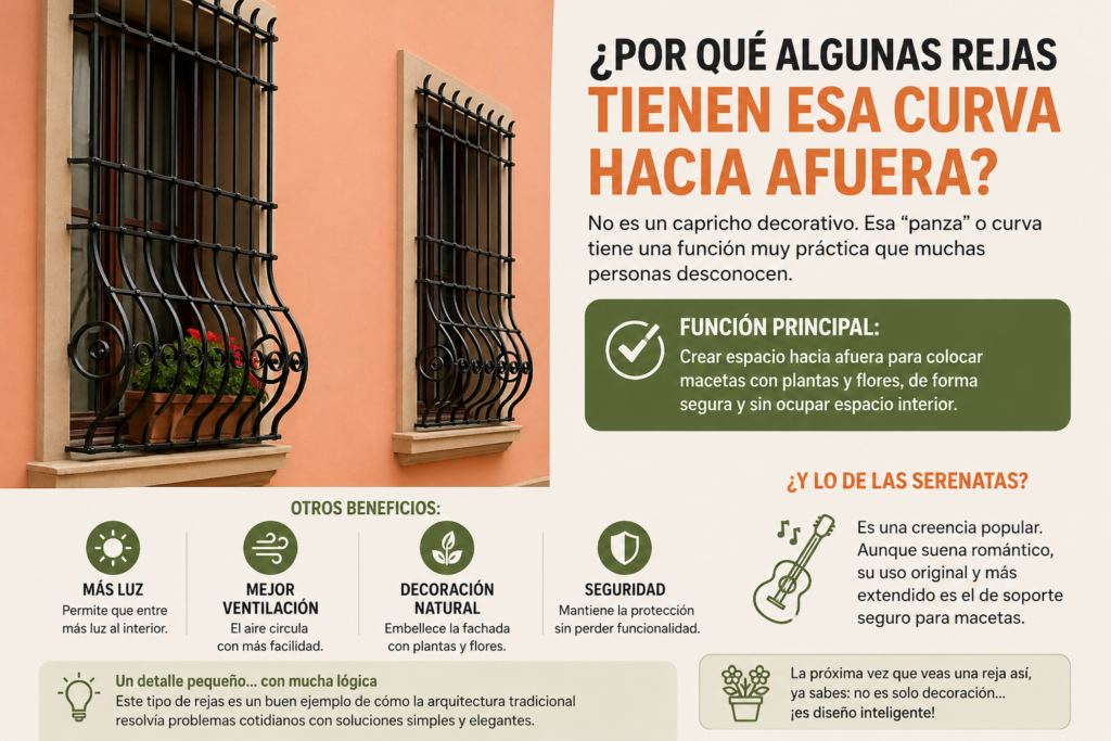 Esa “barriga” o curva en la parte inferior de la reja está diseñada para crear un pequeño espacio extra fuera de la ventana, sin comprometer la seguridad del hogar. Es como un mini balcón protegido.