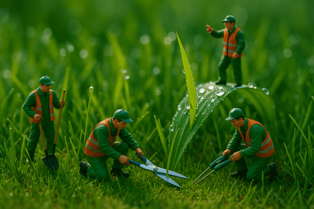 Crea una imagen horizontal 16:9, fotorrealista, ambientada en un jardín frondoso. En primer plano, un grupo de tiny workers jardineros (personajes diminutos con ropa de trabajo y gorras) están cortando el césped usando tijeras de uñas como si fueran podadoras profesionales.
