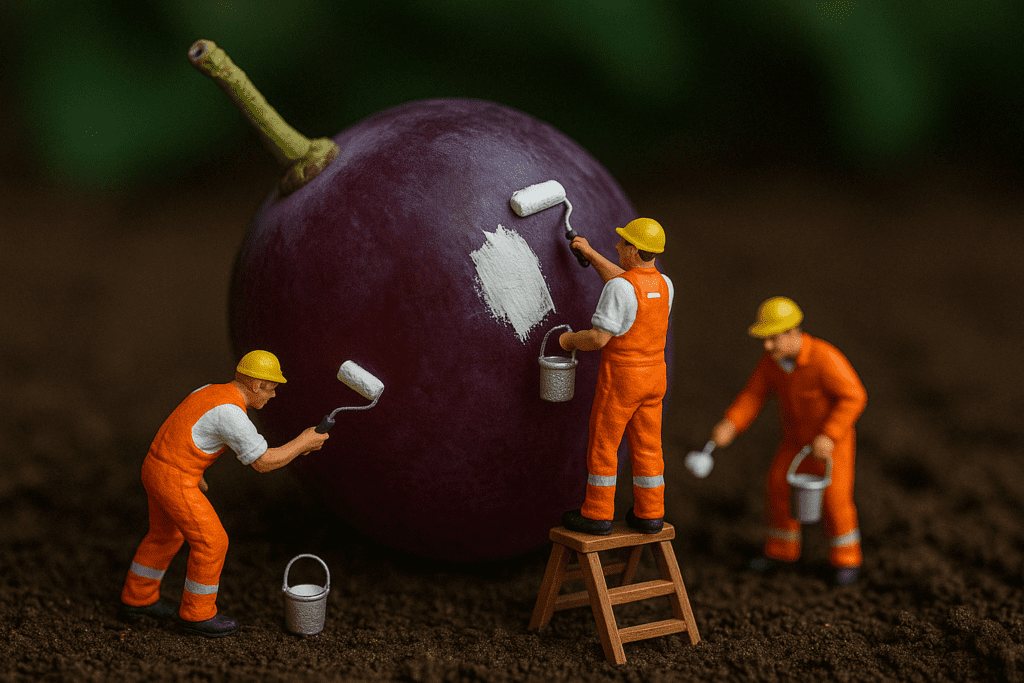 2. 🎨 Tiny pintores pintando una uva gigante como si fuera una pared
