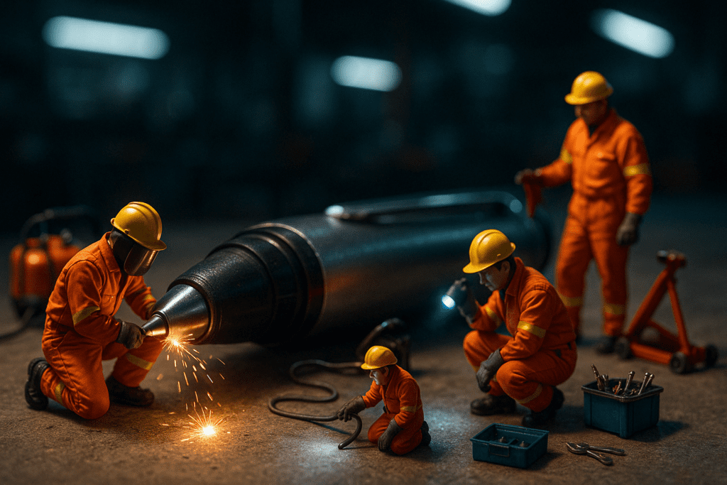 Genera una imagen horizontal 16:9. Tiny workers mecánicos trabajan como si estuvieran en un taller automovilístico, pero el objeto es un bolígrafo gigante.