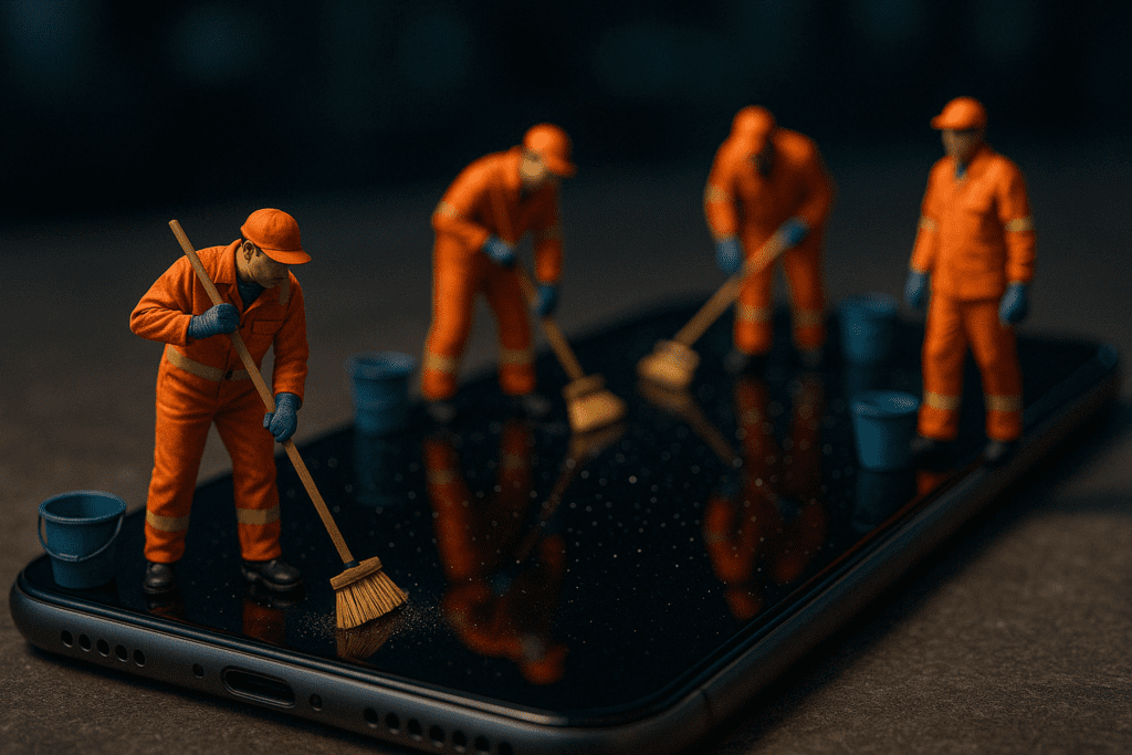 4. 🧹 Tiny limpiadores barriendo una pantalla de móvil con escobas y cubos