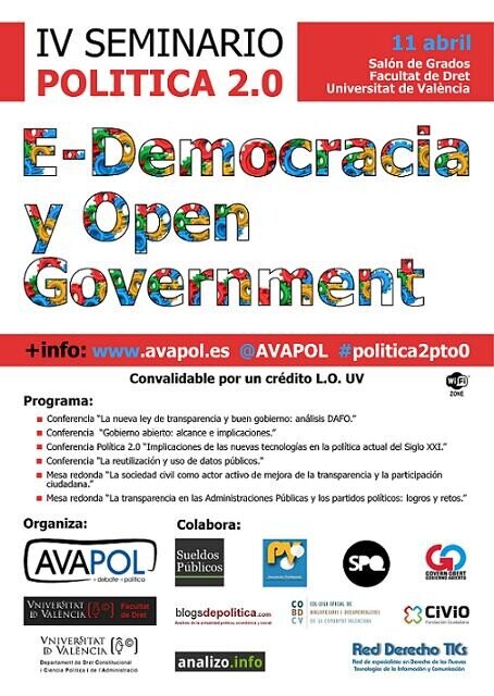 Una vez que nos dimos cuenta de ello, le propusimos a la Universitat de València que la cuarta edición de nuestro Seminario Política 2.0 tratara estos temas, en concreto teníamos que intentar crear conocimiento y opinión en materia de democracia electrónica, transparencia y Open Government (Buen Gobierno). El resultado lo vimos unos meses después cuando creamos el programa de nuestro IV Seminario Política 2.0: E-Democracia y Open Government. Un fantástico evento en el que contaremos con, los que para nosotros, son los agentes implicados en estas materias: académicos, expertos, sociedad civil y políticos.