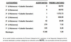 Al no existir boletos acertantes de Primera Categoría (6+1 aciertos), ni de Segunda Categoría (6+0), el fondo destinado a ambas categorías se ofrecerá como BOTE y se acumulará al fondo de premios de la Primera Categoría en el concurso inmediato siguiente.