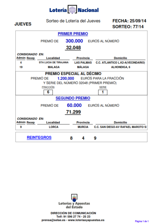 Resultado del sorteo de la Lotería Nacional del 29 de noviembre de 2014 Lotería Nacional, Resultados del sorteo de la loteria nacional de loterias y apuestas del estado Hoy sábado día 29 de noviembre se celebra