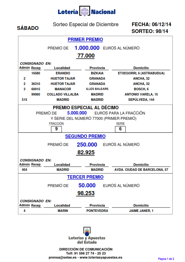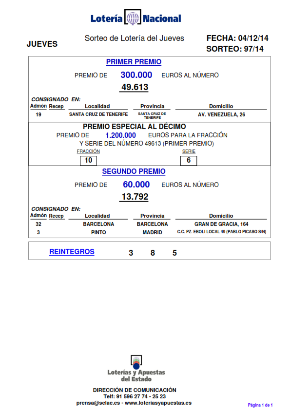 Lotería Nacional.Resultado del sorteo de la loteria nacional jueves 1 de enero de 2015 Lista oficial del Sorteo de la Loteria Nacional del jueves 1 de enero de 2015 El resultado en el