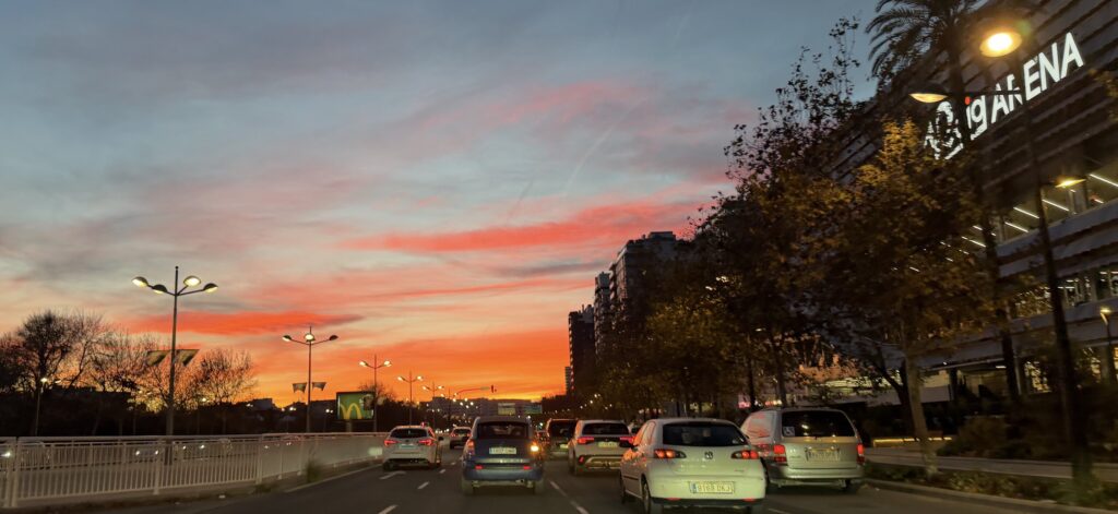 València vivió este viernes un atardecer fuera de lo común. Durante unos minutos, el cielo se transformó en un intenso lienzo de tonos rojos, naranjas y rosados que cubrió buena parte del horizonte urbano, coincidiendo con uno de los momentos de mayor actividad en la ciudad.